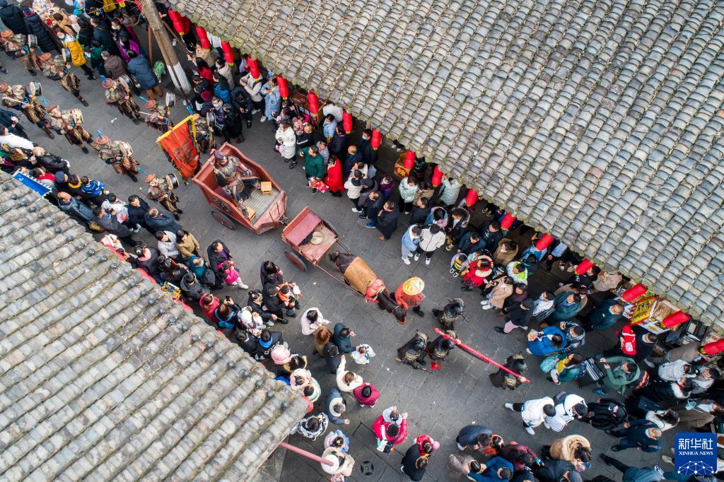 2月3日,在四川省阆中古城,民俗表演“张飞巡城”队伍行进在古街上(无人机照片)。