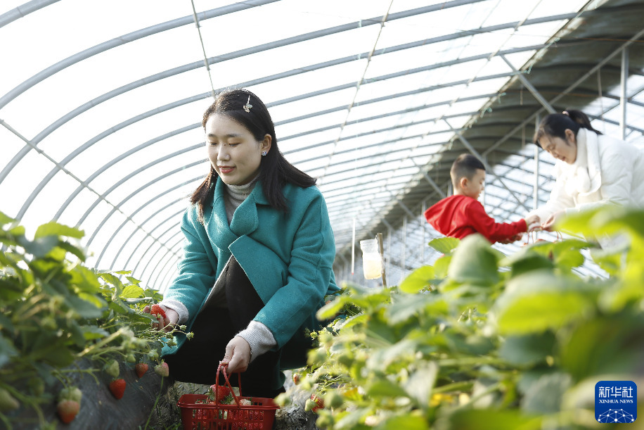 2月3日,游客在河北省邢台市南和区贾宋镇一草莓采摘园采摘草莓。
