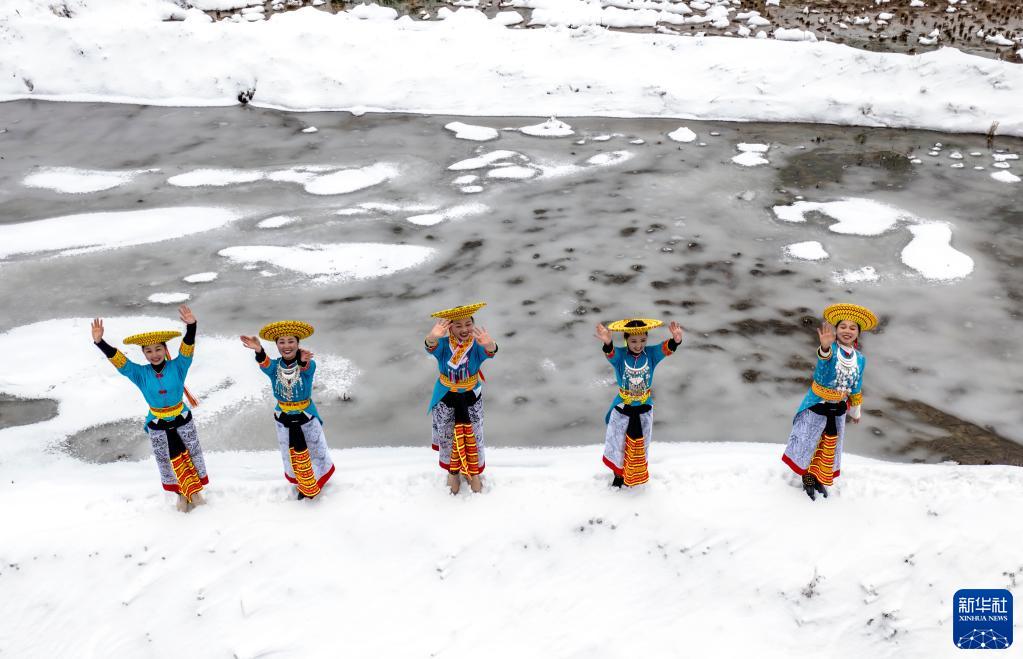 2月3日,游客身着民族服饰在湖南省邵阳市隆回县虎形山瑶族乡大花瑶景区游玩(无人机照片)。