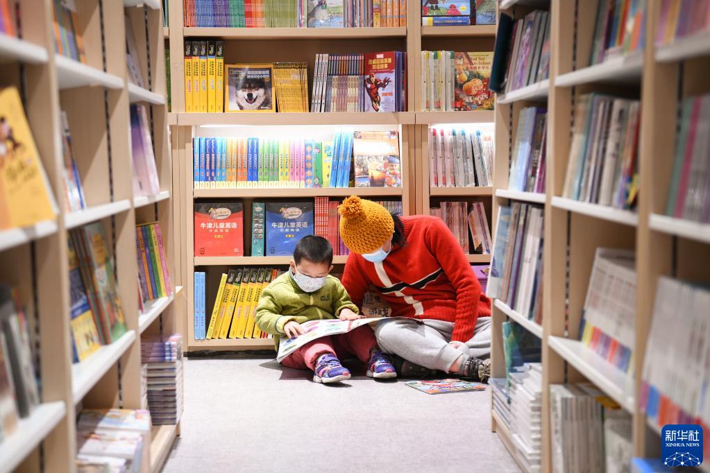 2月3日,在深圳中心书城,家长陪伴孩子一起读书。