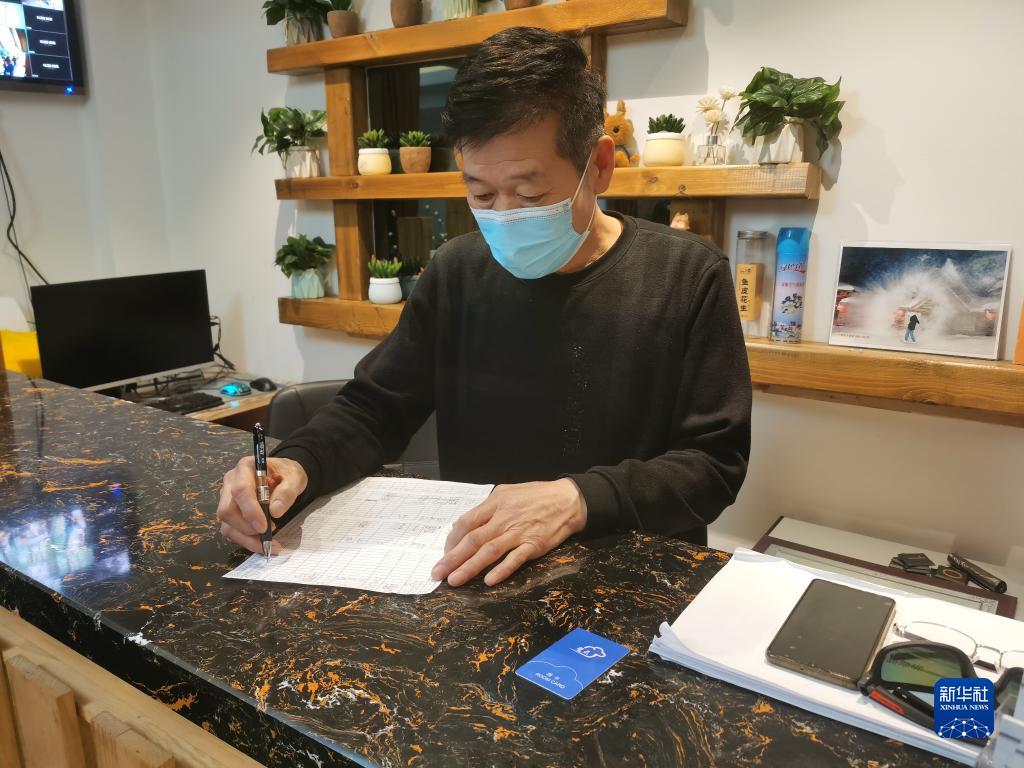 这是2021年1月8日,在黑龙江雪乡,民宿老板樊兆义在柜台前核对住客信息。