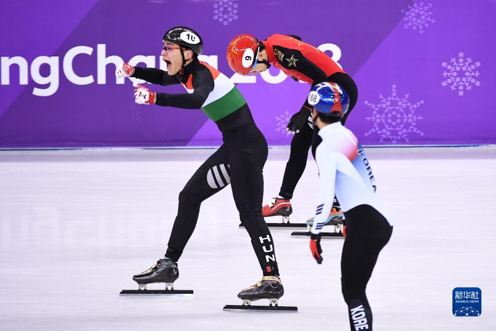 2018年2月22日,匈牙利队选手刘少林(左一)在平昌冬奥会短道速滑男子5000米接力决赛中冲过终点后庆祝。新华社记者鞠焕宗摄