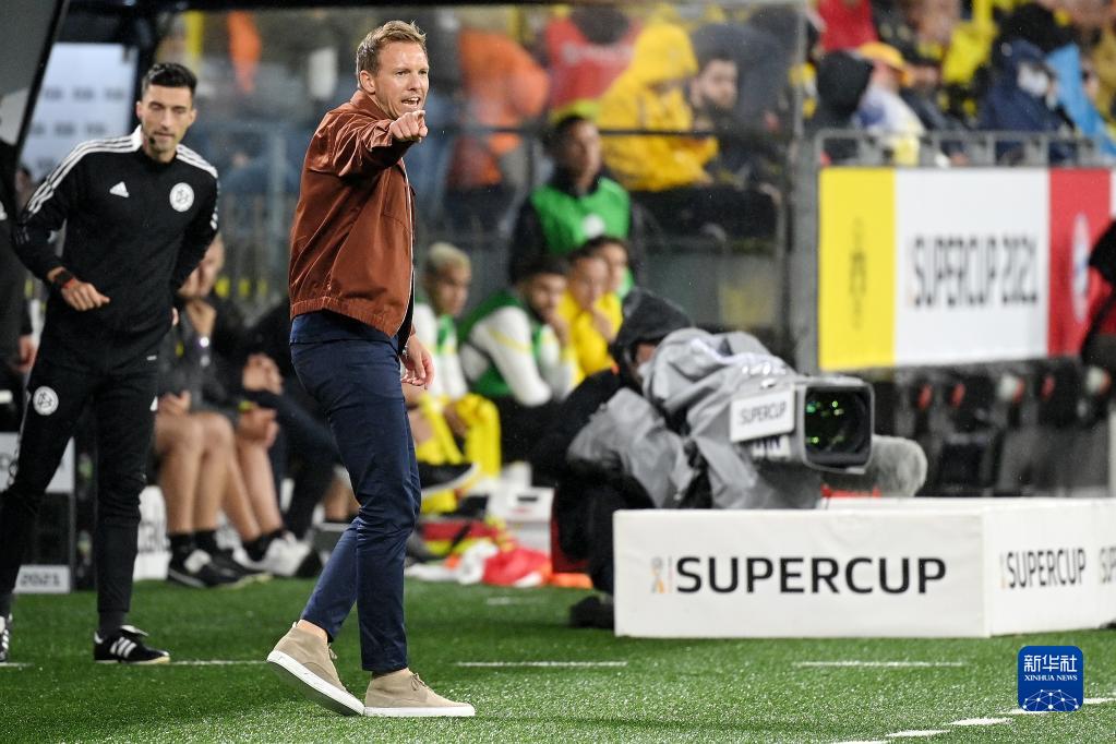 2021年8月17日,德国超级杯,拜仁慕尼黑队以3:1战胜多特蒙德队,夺得冠军。拜仁慕尼黑队主教练纳格尔斯曼在场边指挥。新华社发(乌尔里希·胡夫纳格尔摄)