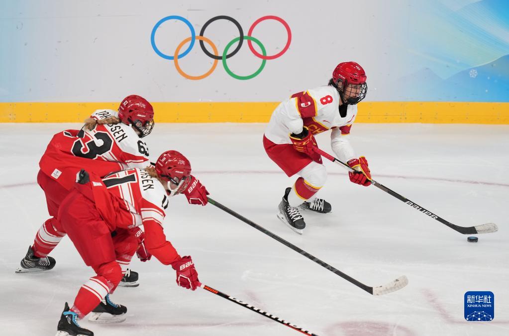 2月4日,中国队球员林绮琪(中)在比赛中进攻。当日,在五棵松体育中心举行的北京冬奥会女子冰球小组赛中,中国队以3比1战胜丹麦队。新华社记者 薛宇舸 摄