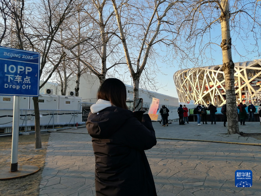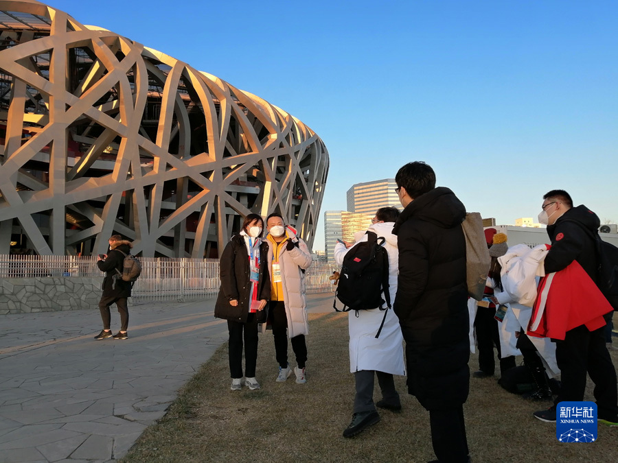开幕式开始前,媒体记者纷纷在鸟巢边合影留念。