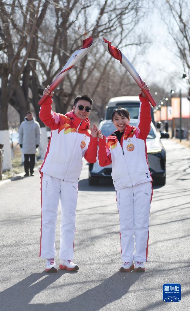 2月4日,火炬手侯琨(左)与蒲天繁进行火炬传递。
