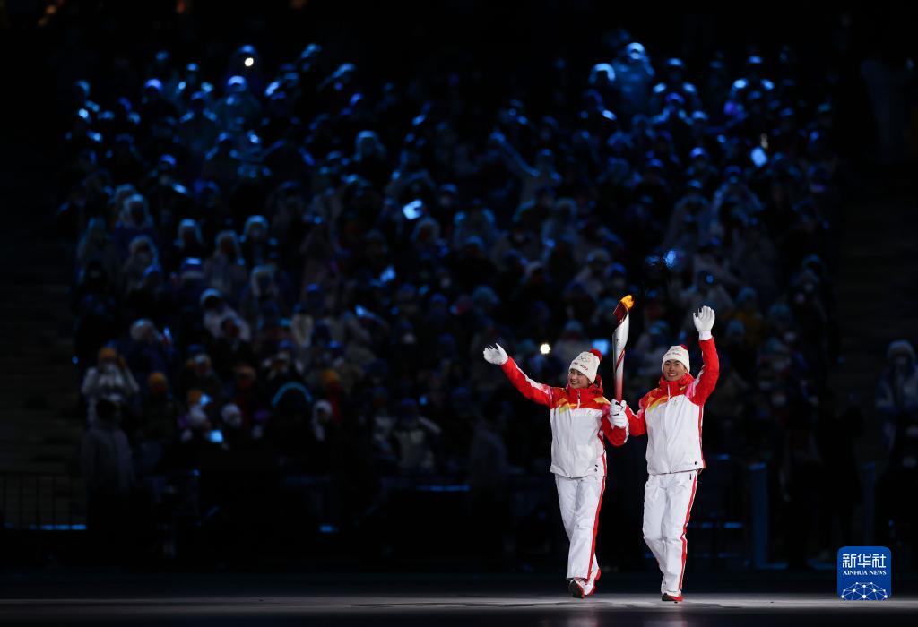 2月4日晚,第二十四届冬季奥林匹克运动会开幕式在北京国家体育场举行。这是最后一棒火炬手迪妮格尔·衣拉木江(右)和赵嘉文。