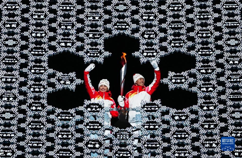 2月4日晚,第二十四届冬季奥林匹克运动会开幕式在北京国家体育场举行。这是最后一棒火炬手迪妮格尔·衣拉木江和赵嘉文。