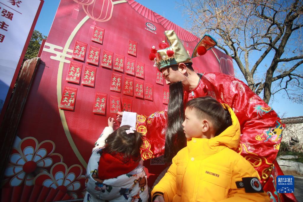 2月5日,在江苏省扬州市何园景区,“财神”向小游客发红包送祝福。