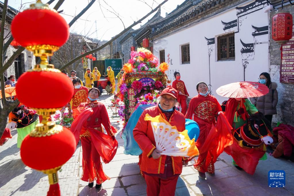 2月5日,民俗艺人在江苏省淮安市盱眙县第一山历史文化街区表演。