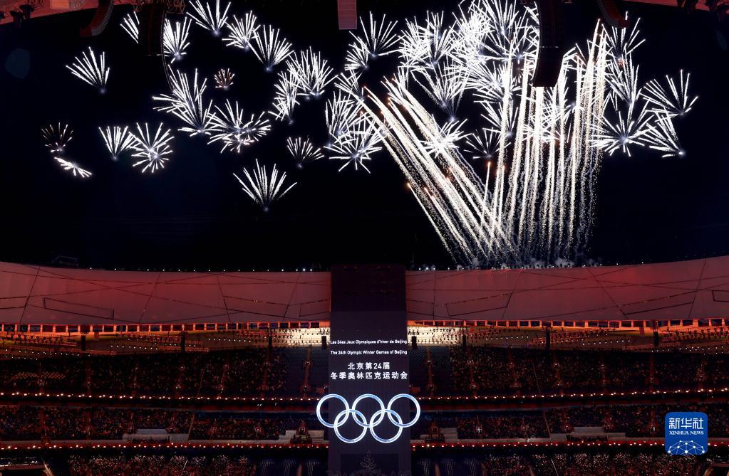 2月4日晚,第二十四届冬季奥林匹克运动会开幕式在北京国家体育场举行。这是主火炬和焰火表演。