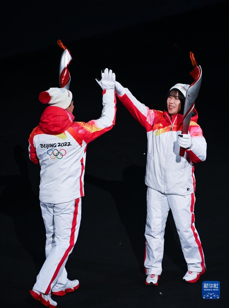 2月4日晚,第二十四届冬季奥林匹克运动会开幕式在北京国家体育场举行。这是最后一棒火炬手迪妮格尔·衣拉木江(左)和赵嘉文。