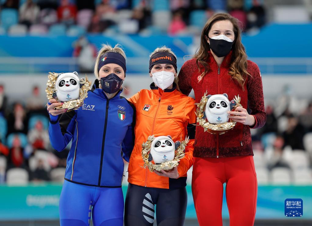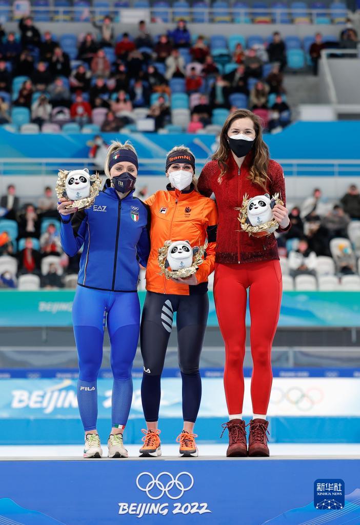 2月5日,冠军荷兰选手伊雷妮·斯豪滕(中)与亚军意大利选手弗兰切丝卡·洛洛布里吉达(左)、季军加拿大选手伊莎贝尔·韦德曼在颁奖仪式上。