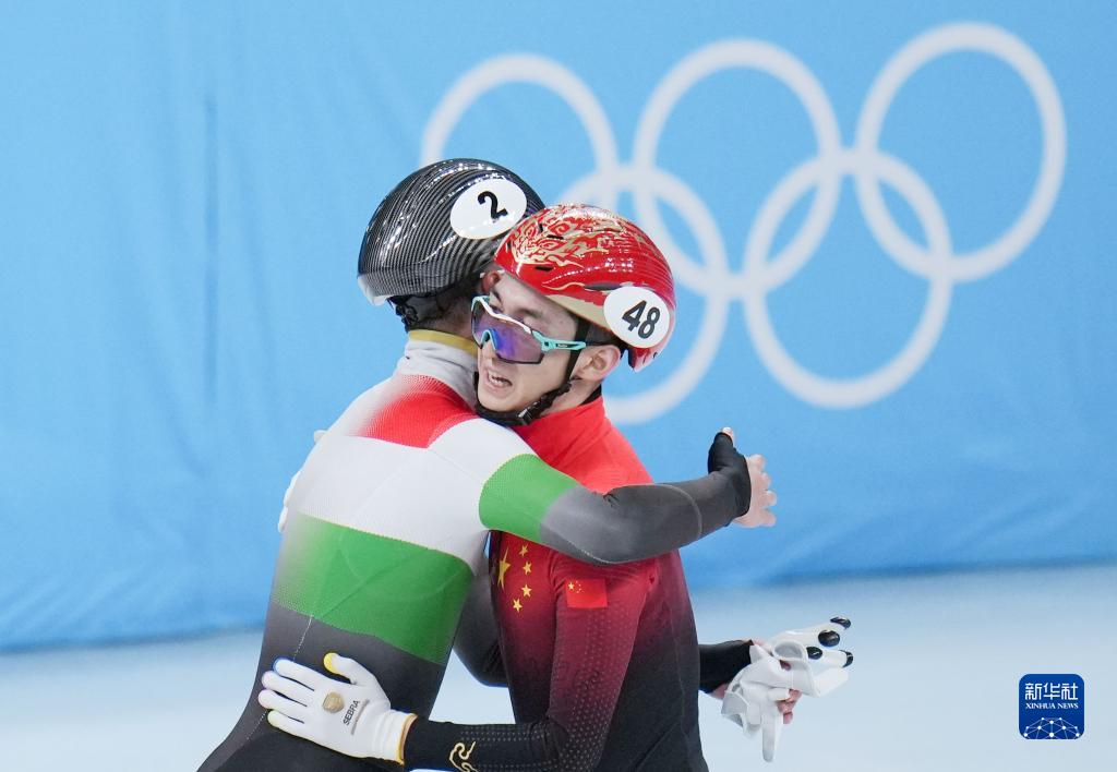 2月5日,中国队选手武大靖(右)在比赛后与匈牙利选手刘少林拥抱致意。