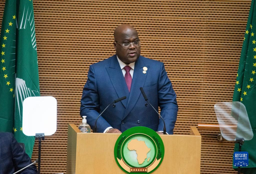 2月5日,在埃塞俄比亚首都亚的斯亚贝巴,非盟轮值主席、刚果(金)总统齐塞克迪在非盟首脑会议上发表讲话。新华社发(迈克尔·特韦尔德摄)