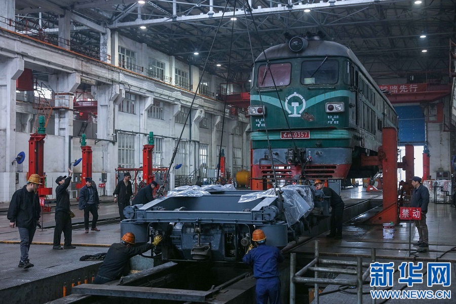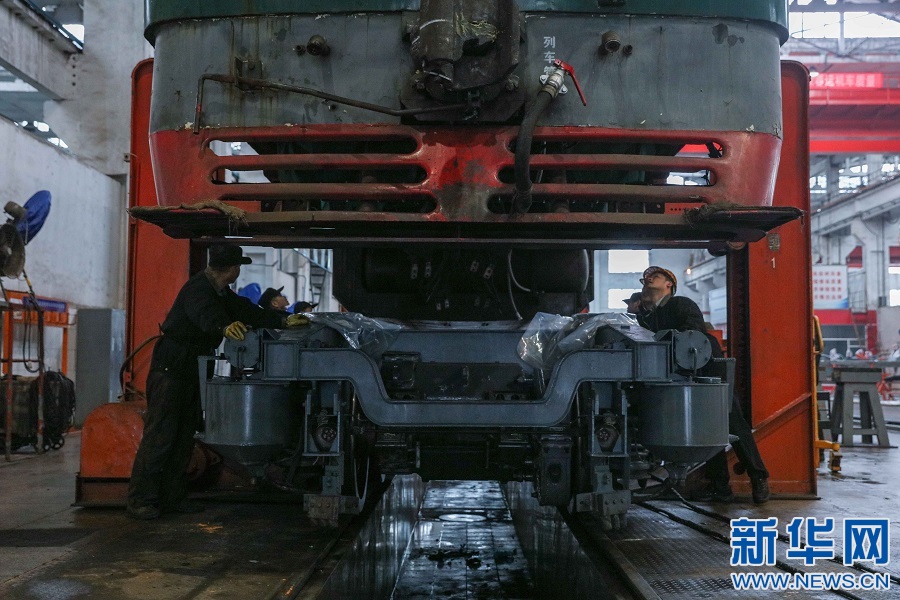 中铁南昌局南昌机务段机车钳工在对内燃机车转向架进行安装。新华网发 赵磊 摄