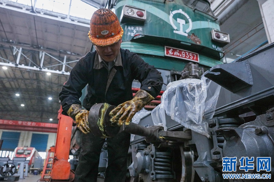 中铁南昌局南昌机务段机车钳工在对内燃机车牵引杆进行安装。新华网发 赵磊 摄