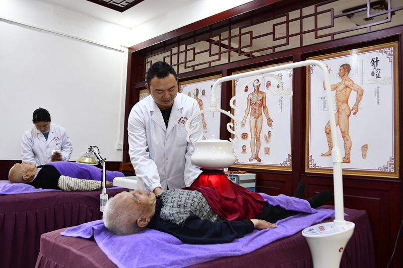 江西省兴国县田庄上养老中心的医护人员为老人进行中医理疗。