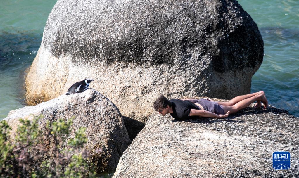2月5日,一名男子在南非西蒙镇海滩边模仿企鹅。