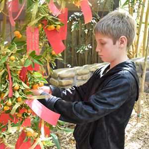 2月5日,在美国加利福尼亚州圣迭戈野生动物园,一名参加庆祝活动的儿童悬挂自己的新年愿望卡片。新华社记者 高山 摄