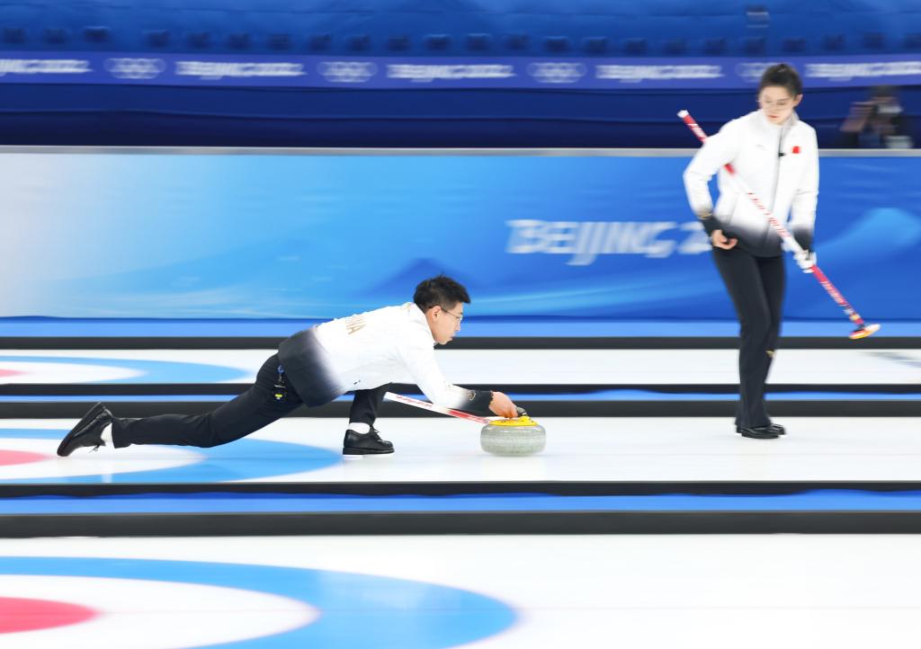 2月6日,中国队选手范苏圆和凌智(左)在北京2022年冬奥会冰壶混双循环赛比赛中,以5比6不敌英国队。新华社记者王婧嫱摄