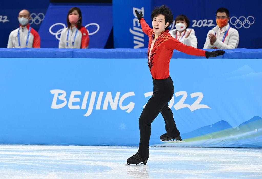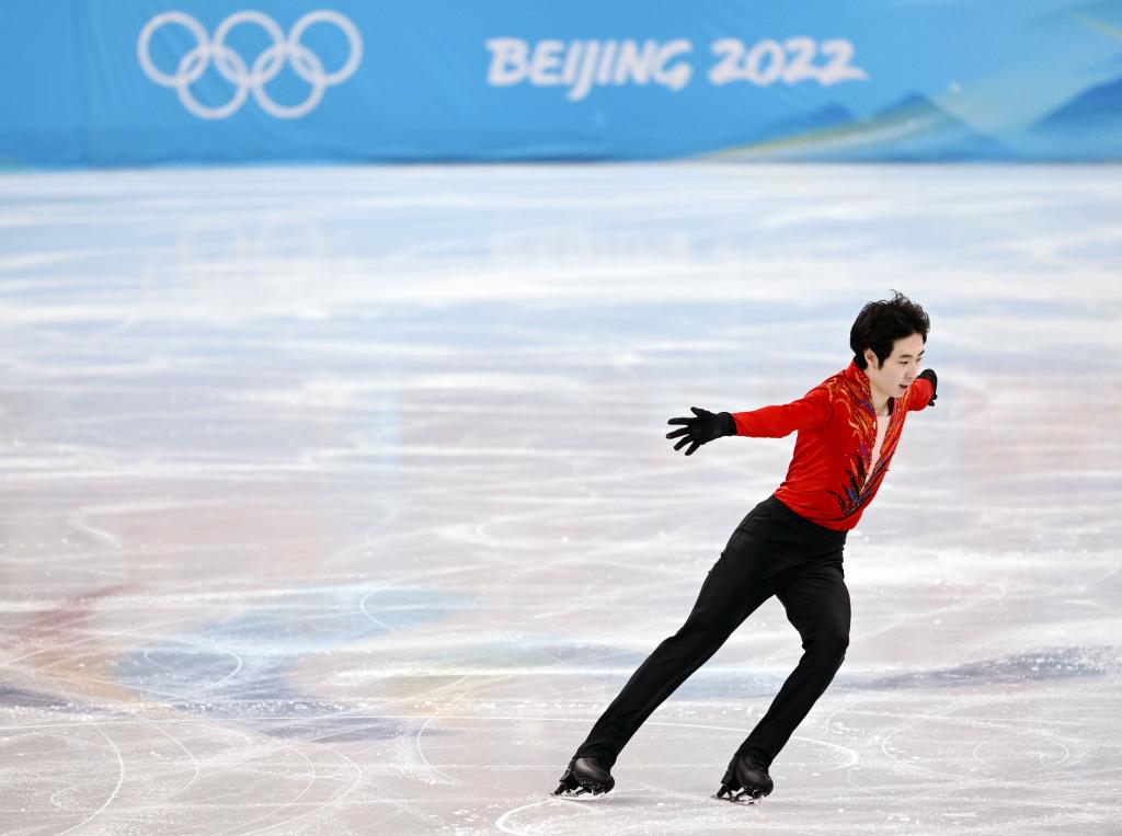 2月6日,中国选手金博洋在北京2022年冬奥会花样滑冰团体赛男子单人滑自由滑比赛中。新华社记者马宁摄