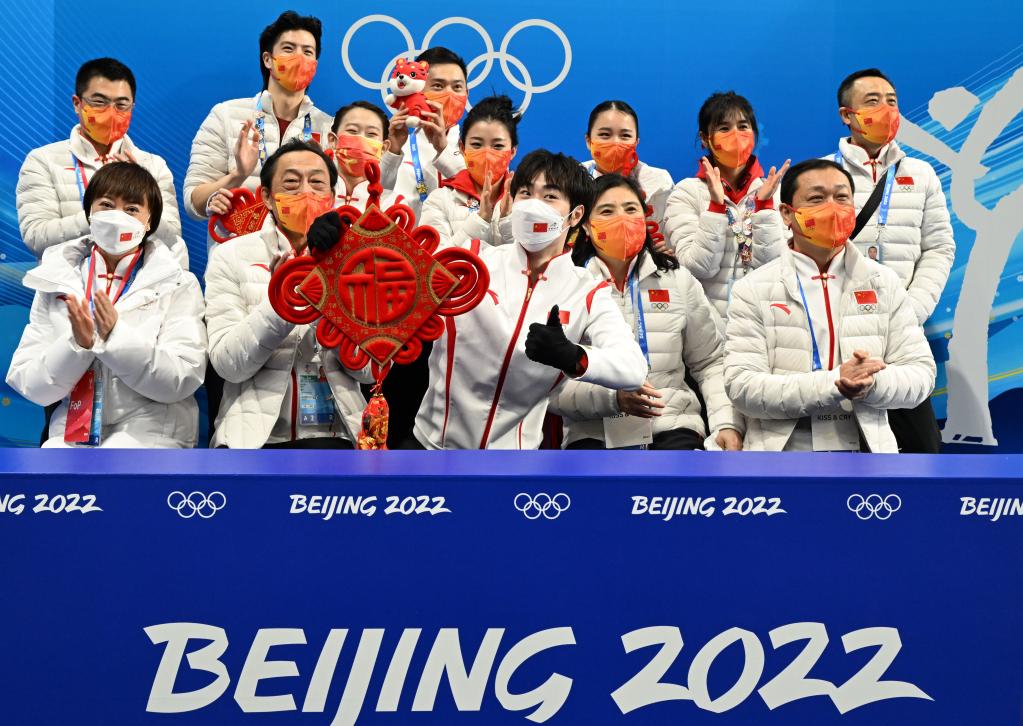 2月6日,中国选手金博洋(中)在比赛后等待成绩时展示“中国结”。新华社记者马宁摄