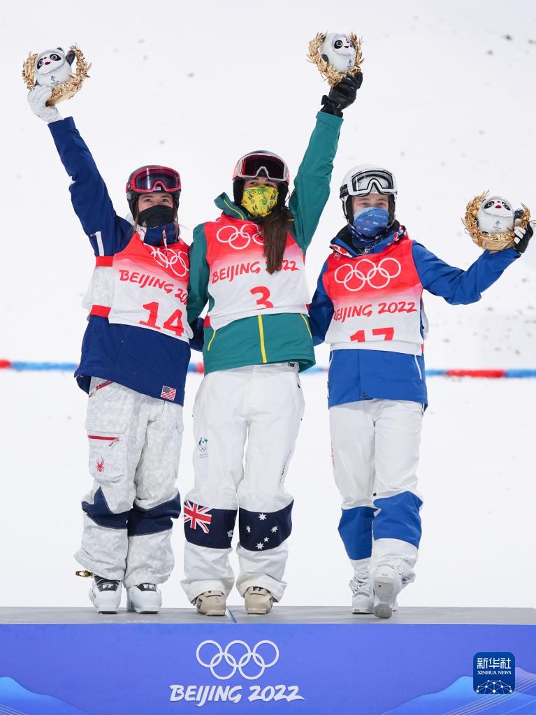 2月6日,冠军澳大利亚选手杰卡拉·安东尼(中)、亚军美国选手杰琳·考夫(左)和季军俄罗斯奥委会选手阿纳斯塔西娅·斯米尔诺娃在领奖台上庆祝。