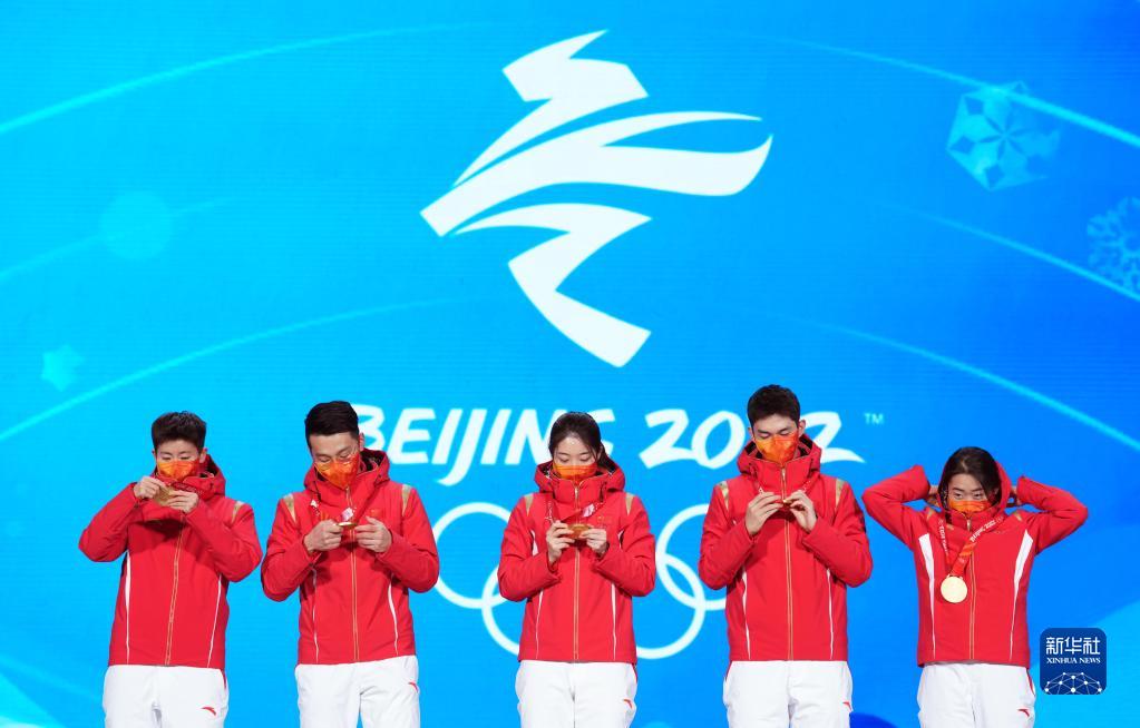 2月6日,中国队选手范可新、任子威、曲春雨、武大靖、张雨婷(从左至右)在奖牌颁发仪式上。