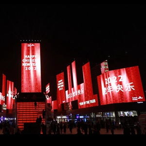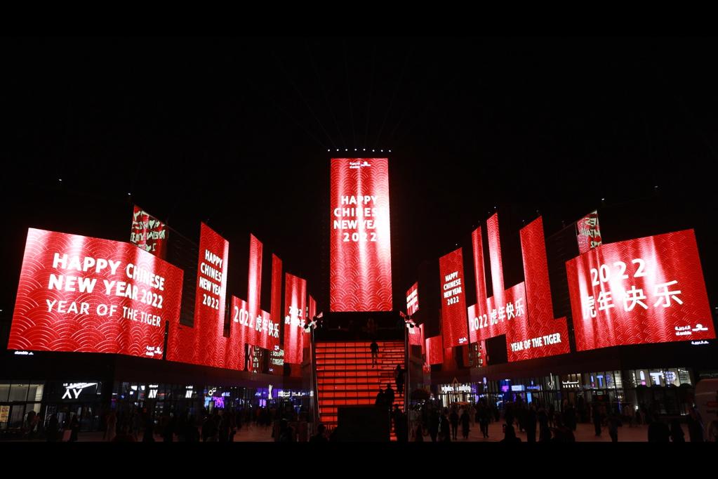 2月3日晚,沙特阿拉伯首都利雅得的“利雅得城市大道”广场数十块LED屏幕播放庆祝春节的主题视频。视频以红色为主色调,既有中国古建筑、红灯笼等画面,也有中英文的“虎年快乐”等字样。这是沙特首都利雅得首次点亮“中国红”以庆祝中国春节。(新华社记者王海洲摄)