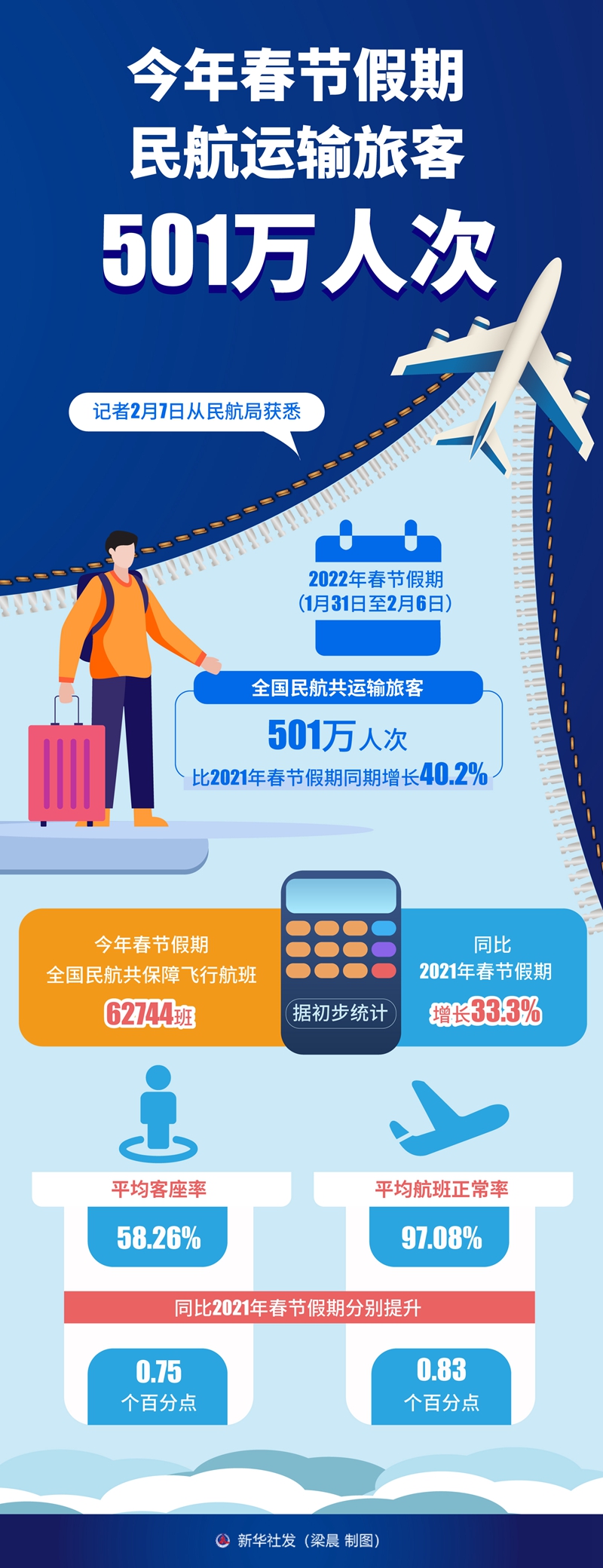 新华社北京2月7日电(记者周圆)记者7日从民航局获悉,2022年春节假期(1月31日至2月6日)全国民航共运输旅客501万人次,比2021年春节假期同期增长40.2%。