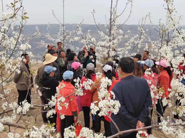 在山西省汾西县,农技专家在教村民如何对梨树进行疏花。(受访者供图)