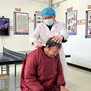 春节前,银川市救助管理站的工作人员帮刘银汉理发。(受访者供图)