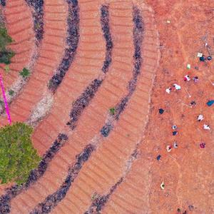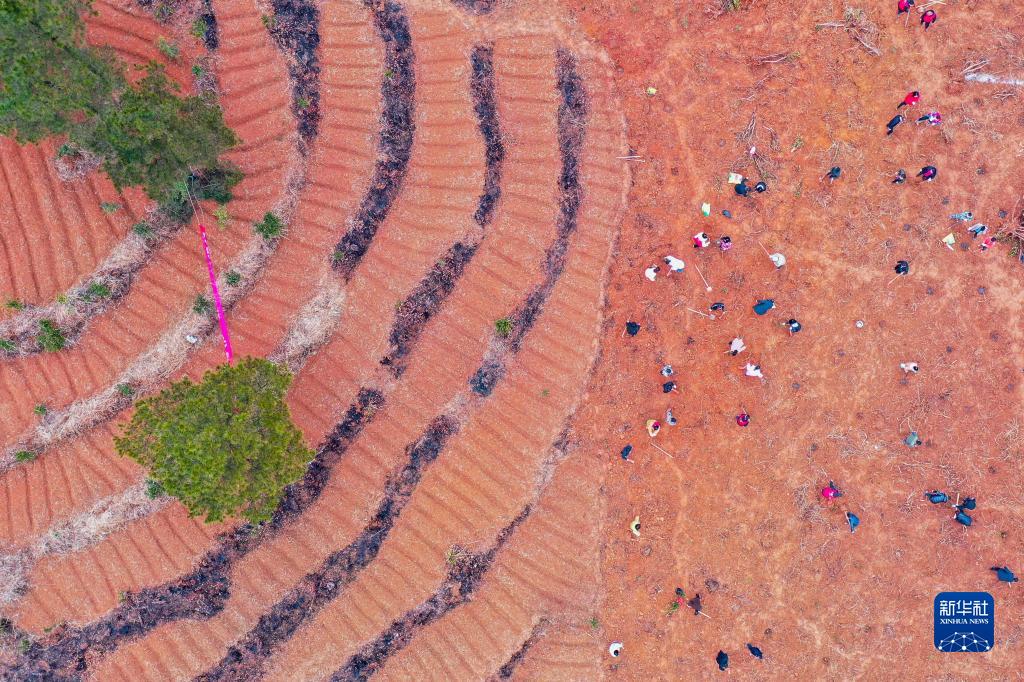 2月7日,在贵州省铜仁市玉屏侗族自治县朱家场镇鱼塘村,人们在植树(无人机照片)。