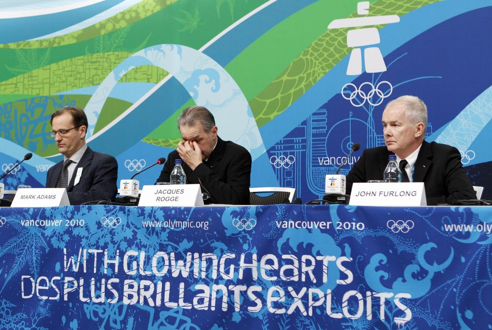 时任国际奥委会主席罗格(中)在事故发生后的新闻发布会上(2010年2月12日摄)。