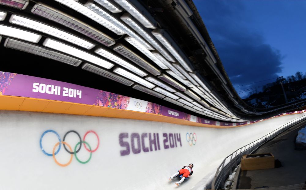 奥地利选手埃格在索契冬奥会男子单人雪橇比赛中(2014年2月9日摄)。