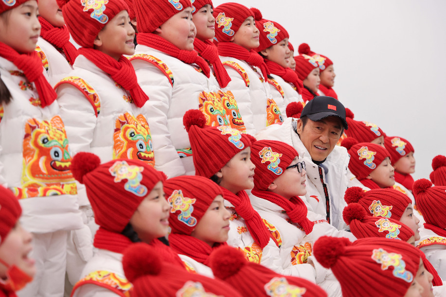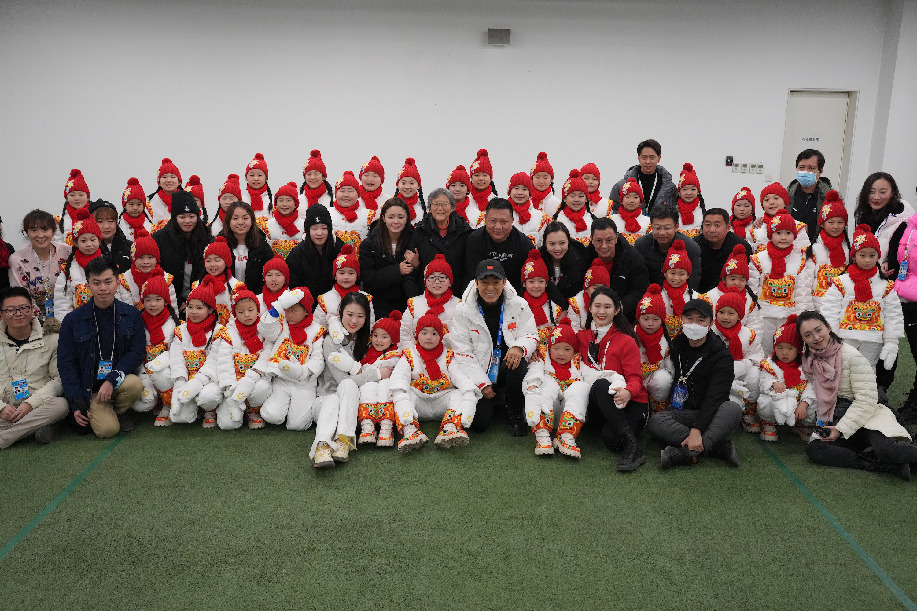 ⬆️1月15日,在国家体育场(鸟巢)候场间,马兰花儿童合唱团的孩子们与开幕式总导演张艺谋和工作人员合影。