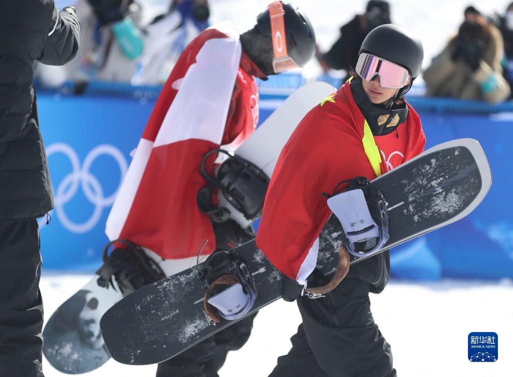 2月7日,中国选手苏翊鸣(左)在比赛后庆祝。