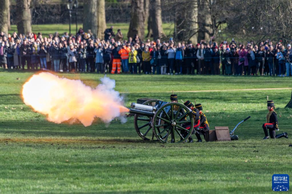 2月7日,英国士兵在伦敦白金汉宫旁的格林公园鸣放礼炮,庆祝女王伊丽莎白二世登基70周年。
