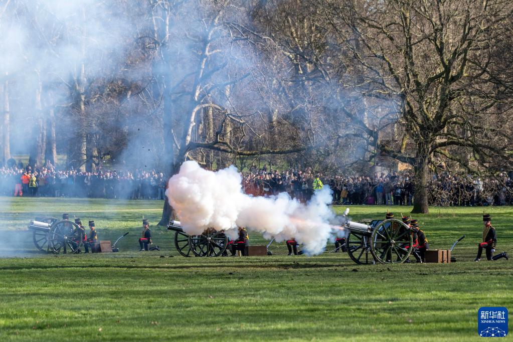 2月7日,英国士兵在伦敦白金汉宫旁的格林公园鸣放礼炮,庆祝女王伊丽莎白二世登基70周年。