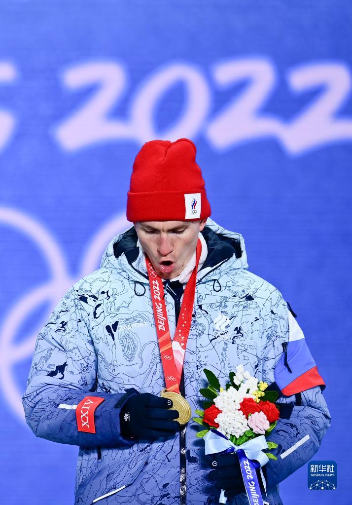 2月7日,冠军俄罗斯奥委会选手亚历山大·博利舒诺夫在奖牌颁发仪式上。