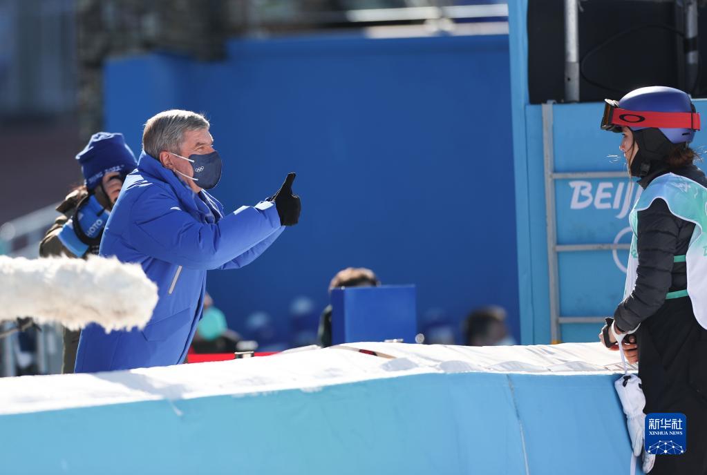 2月8日,国际奥委会主席巴赫(左)向中国选手谷爱凌表达祝贺。