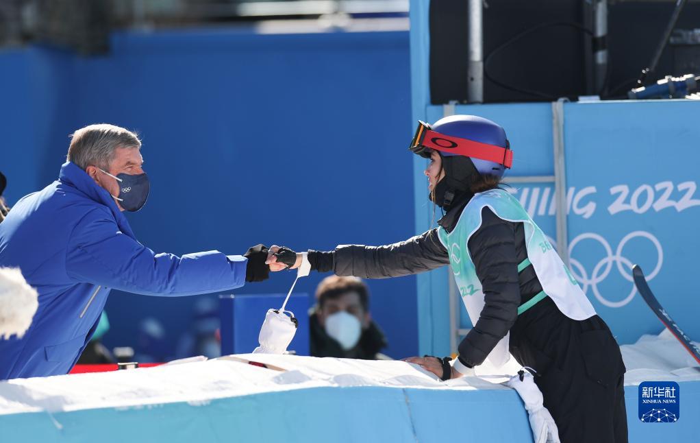 2月8日,国际奥委会主席巴赫(左)向中国选手谷爱凌表示祝贺。