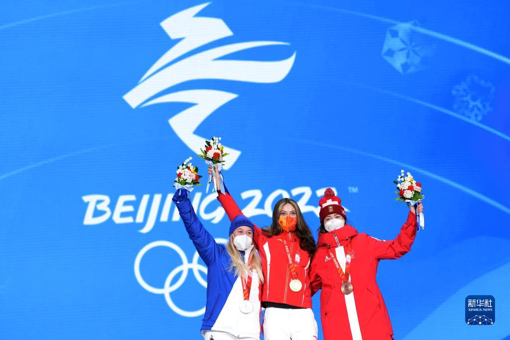 2月8日,冠军中国队选手谷爱凌(中)、亚军法国选手泰丝·勒德(左)和季军瑞士选手玛蒂尔德·格雷莫德在奖牌颁发仪式上。