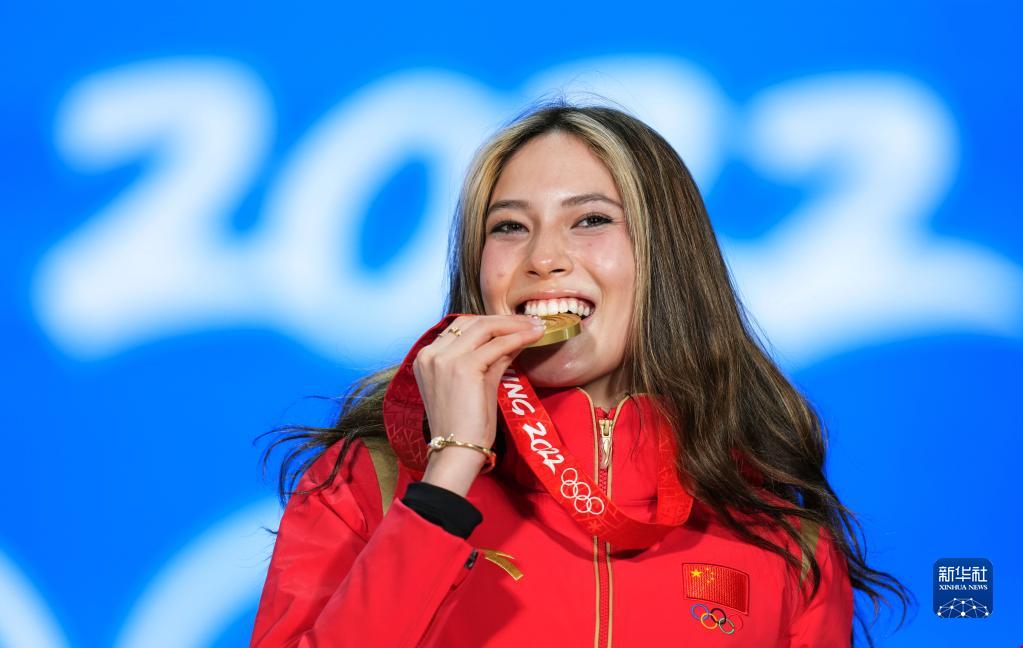 2月8日,冠军中国队选手谷爱凌在奖牌颁发仪式上。