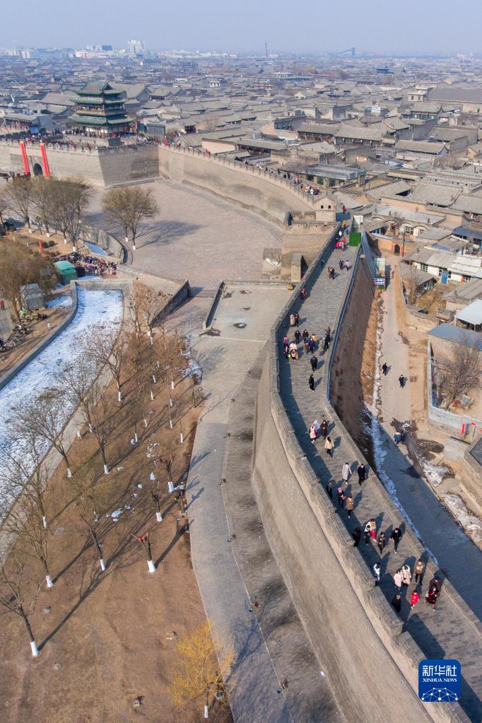 2月8日,游客在平遥古城内参观(无人机照片)。新华社记者 杨晨光 摄