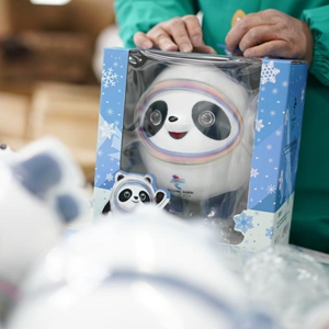 2月8日,工人在特许生产商的车间里包装“冰墩墩”。(新华社记者 季春鹏 摄)