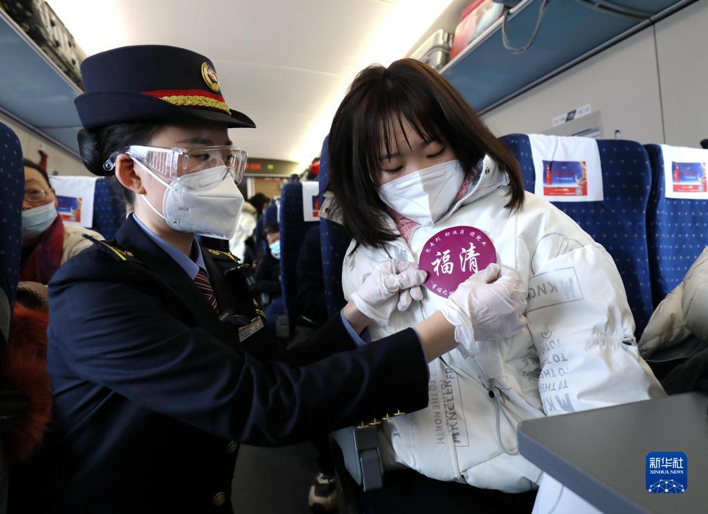 2月9日,在兰州西开往福州的G1904次列车上,乘务员为务工人员贴上接站标识牌。这是2022年闽陇两省间开行的首趟务工高铁专列,载有540名来自甘肃定西的务工人员。
