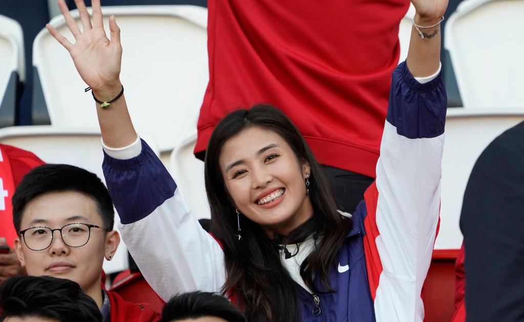 2019年6月13日,中国女足守门员赵丽娜在看台上加油助威。新华社记者丁旭摄