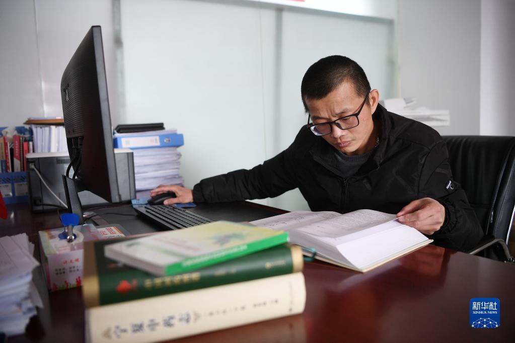 郑国华在宁夏泾源县科技局查阅资料(1月29日摄)。新华社记者 王鹏 摄